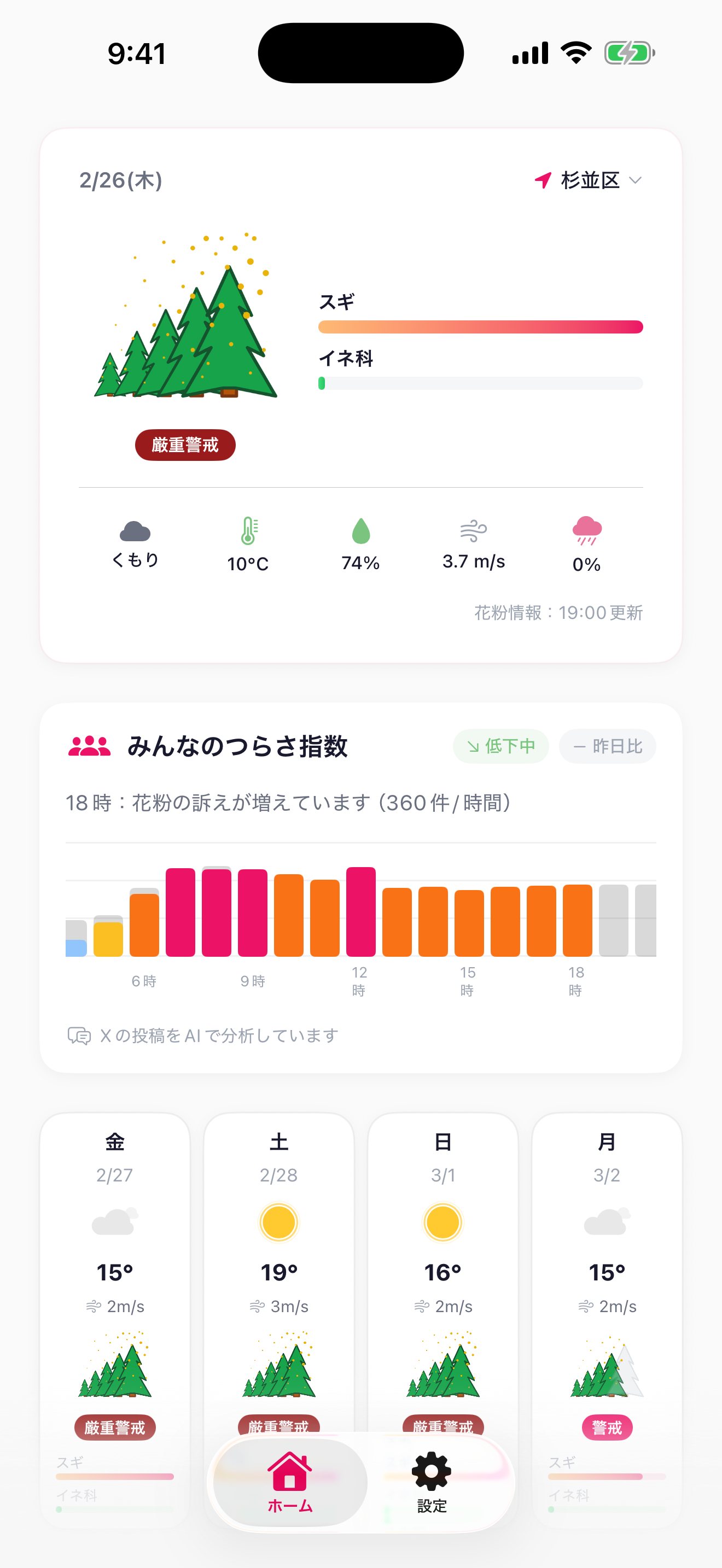 朝の通知で今日の花粉レベルをチェック。マスクや薬の準備、洗濯物の室内干しの判断に役立ちます。