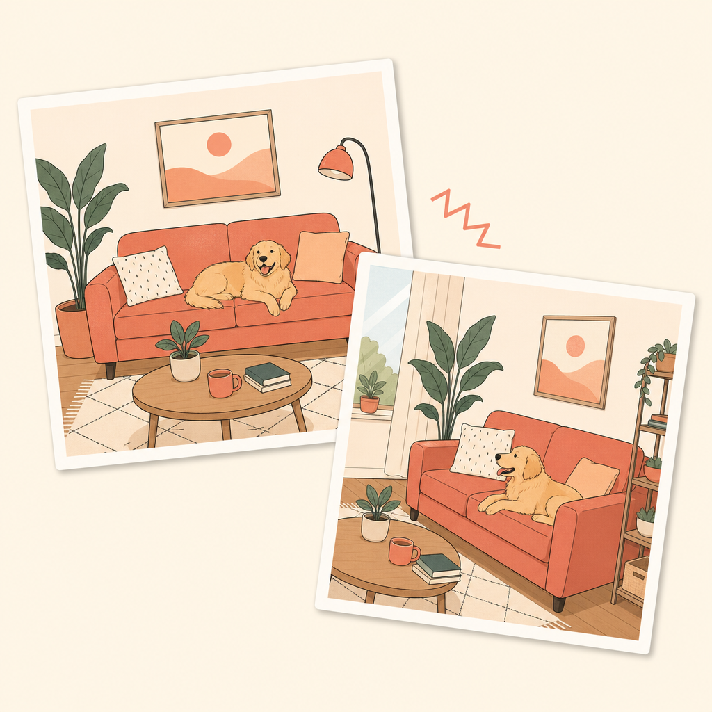Room makeovers, renovations, repairs — compare the change accurately by matching the original frame.